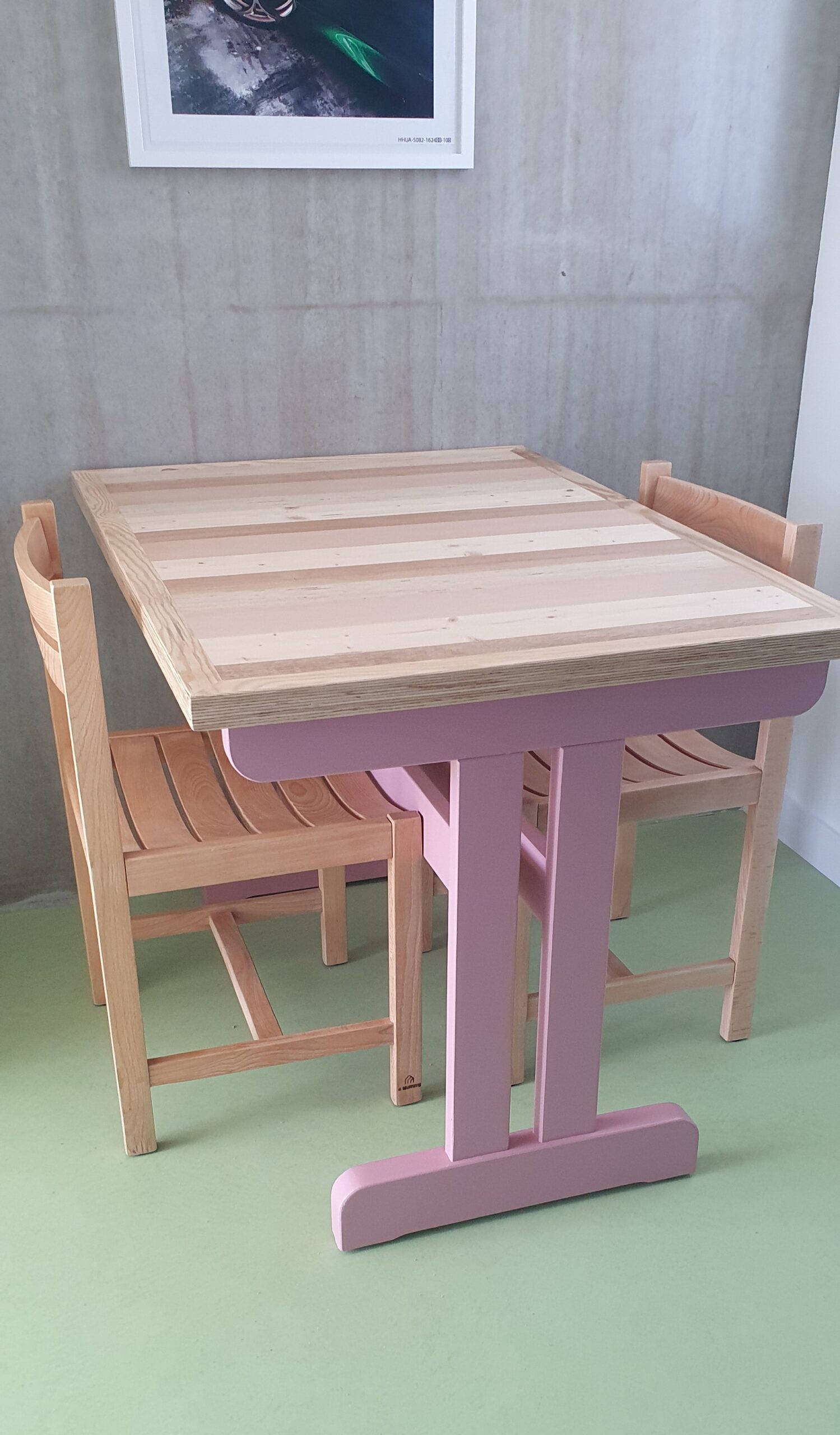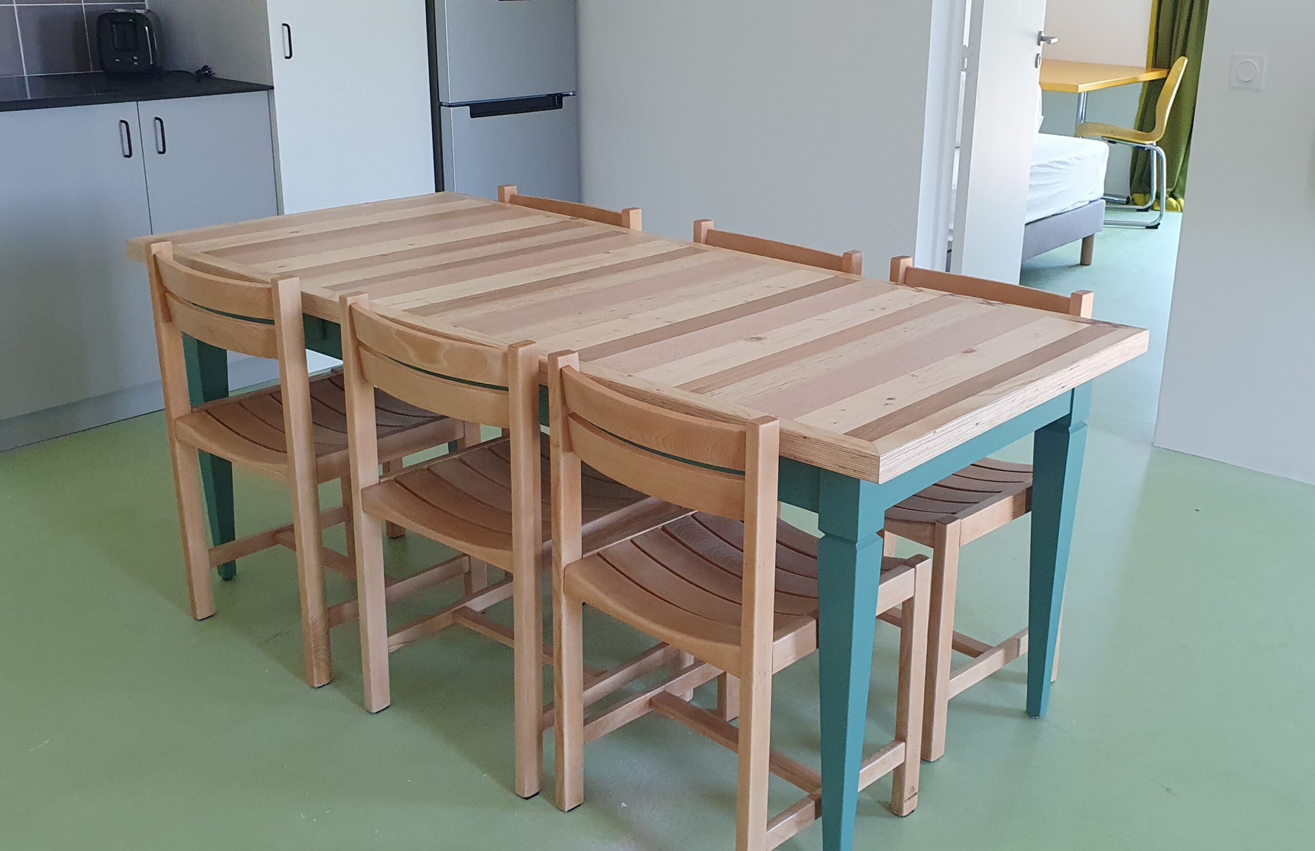 Les 27 plateaux de tables de cuisine (soit plus de 32 mètres de long sur 80 cm de large) ont été réalisés en technique mix-bois avec des éléments de mobilier démantelés (lits, armoires…) mixant ainsi plusieurs essences de bois (chêne, pin, hêtre…).