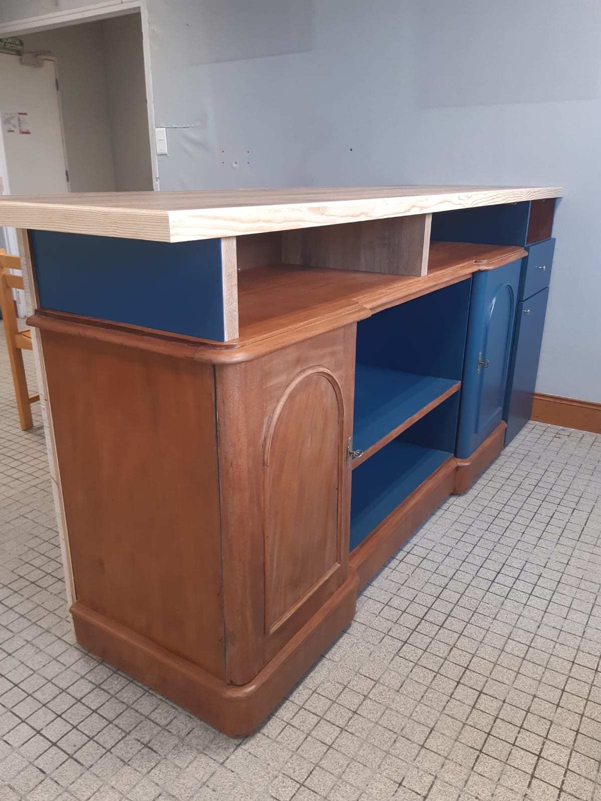 Banquettes, poufs et autres tables basses en réemploi cohabitent désormais avec un bar upcyclé à partir d’un ancien buffet et des tables sur-mesure avec plateau mix-bois d’économie circulaire.